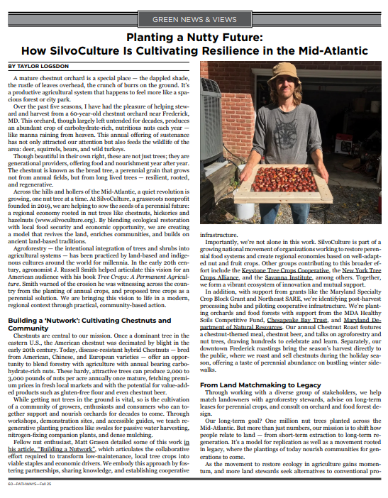 Read the article, titled “Planting a Nutty Future: How SilvoCulture Is Cultivating Resilience in the Mid-Atlantic” by Taylor Logsdon on page 60 of Pathway’s Fall 2025 Magazine Issue. Click here.